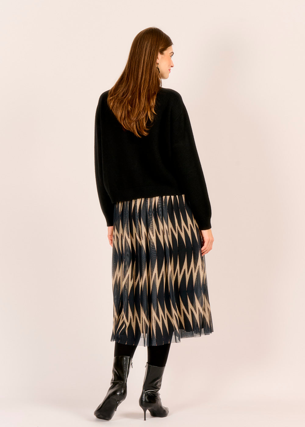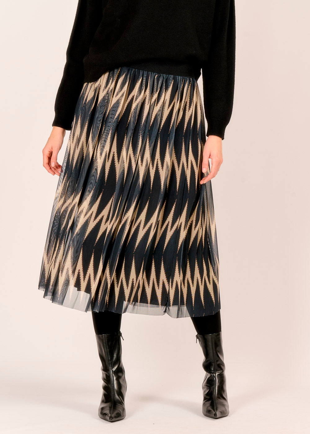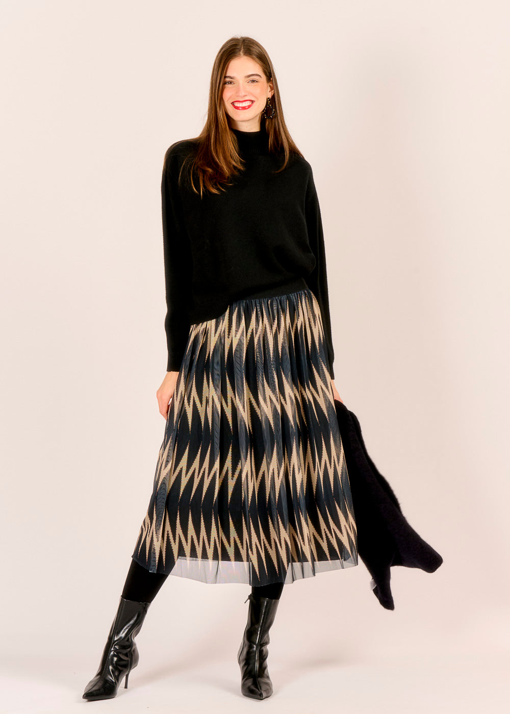 Ein Hauch von Festlichkeit, der die Blicke fesselt: Dieser zauberhafte Tüllrock in dunklen Tönen präsentiert sich mit einem dezenten, grafischen Muster. Die feinen Plissees und das leichte Tüllmaterial verleihen jedem Schritt eine schwingende Eleganz, ideal für glanzvolle Anlässe. Er ist die perfekte Wahl für die Feiertage und bringt einen Hauch von Magie in Ihre Garderobe.