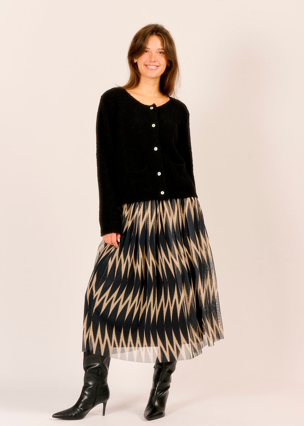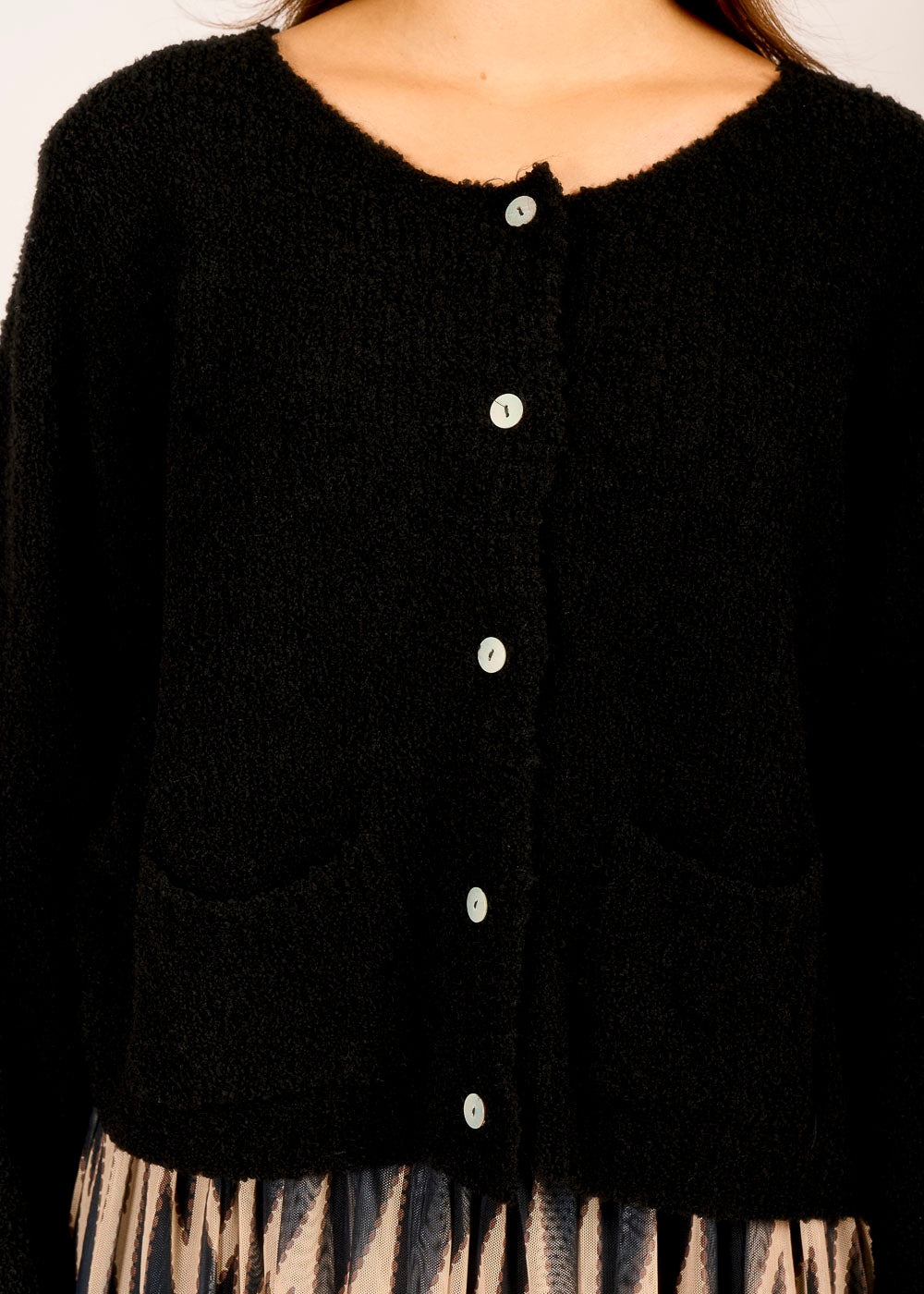 Dieser edle schwarze Cardigan mit Wollanteil passt sich deinem Alltag an und macht ihn ein wenig weicher, wärmer und stilvoller. Offen getragen wirkt er lässig-elegant, geschlossen schenkt er Struktur und Kontur. Für Looks, die schlicht bleiben und dennoch Eindruck hinterlassen.