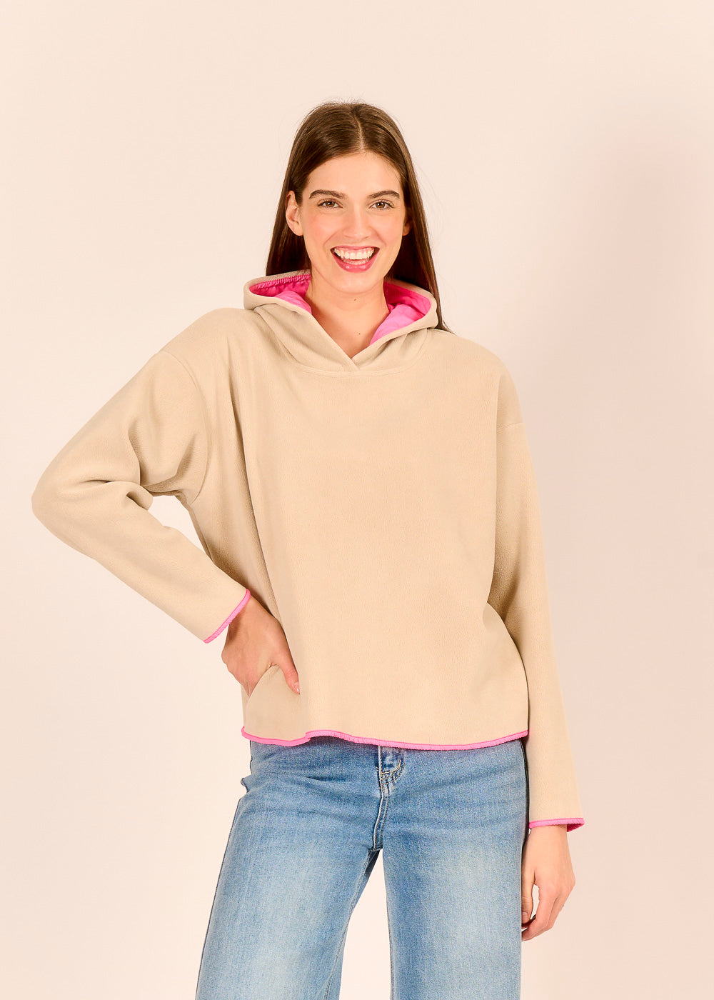 Raffiniertes Farbspiel: Der Fleece-Hoodie aus Viskose wird durch farblichen Kontrast an Kapuze und Saum zum echtem Blickfang. Die sanfte Grundfarbe trifft auf mutige Akzente und strahlt Ruhe und Energie zugleich aus – perfekt für deinen Freizeitlook.