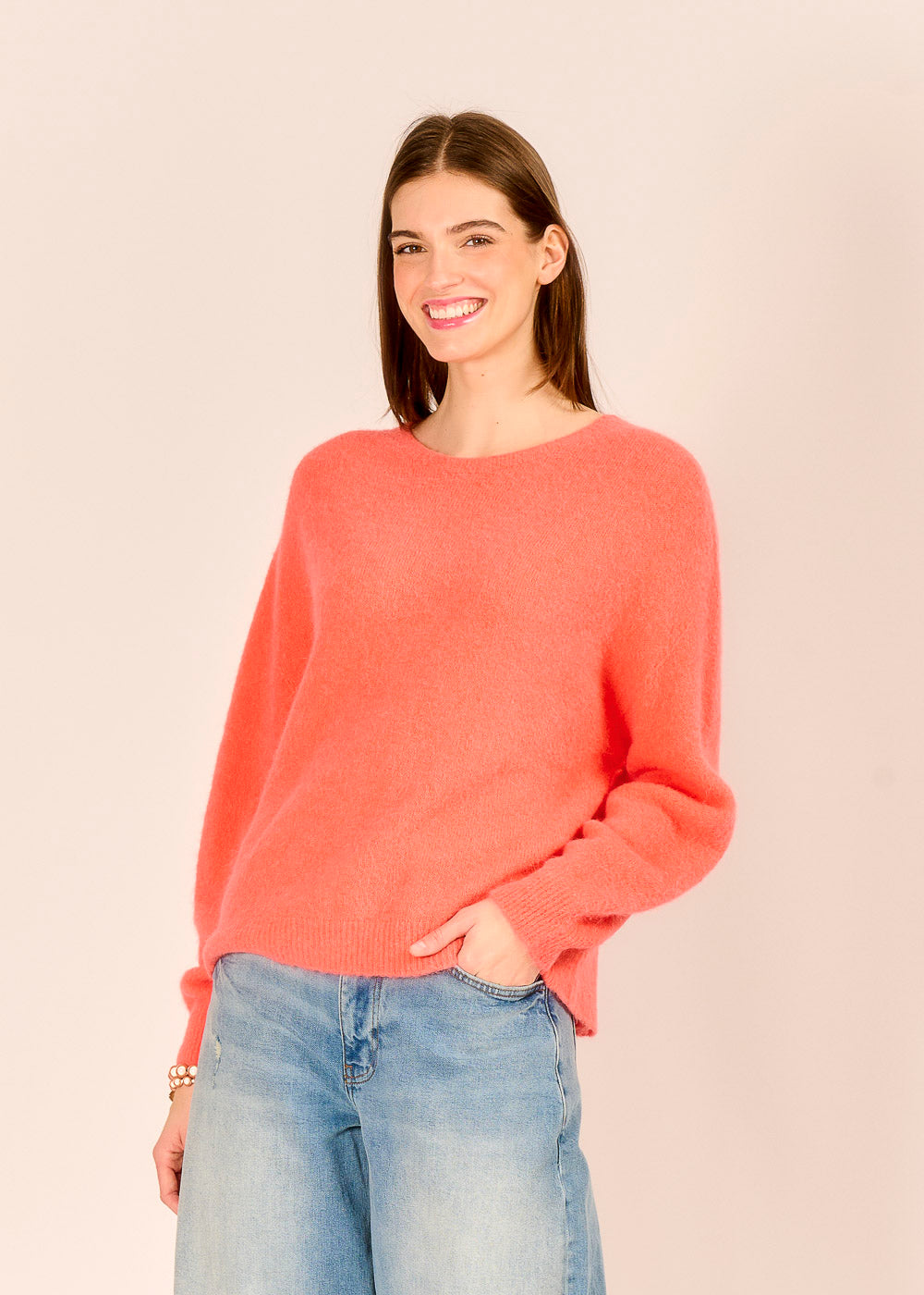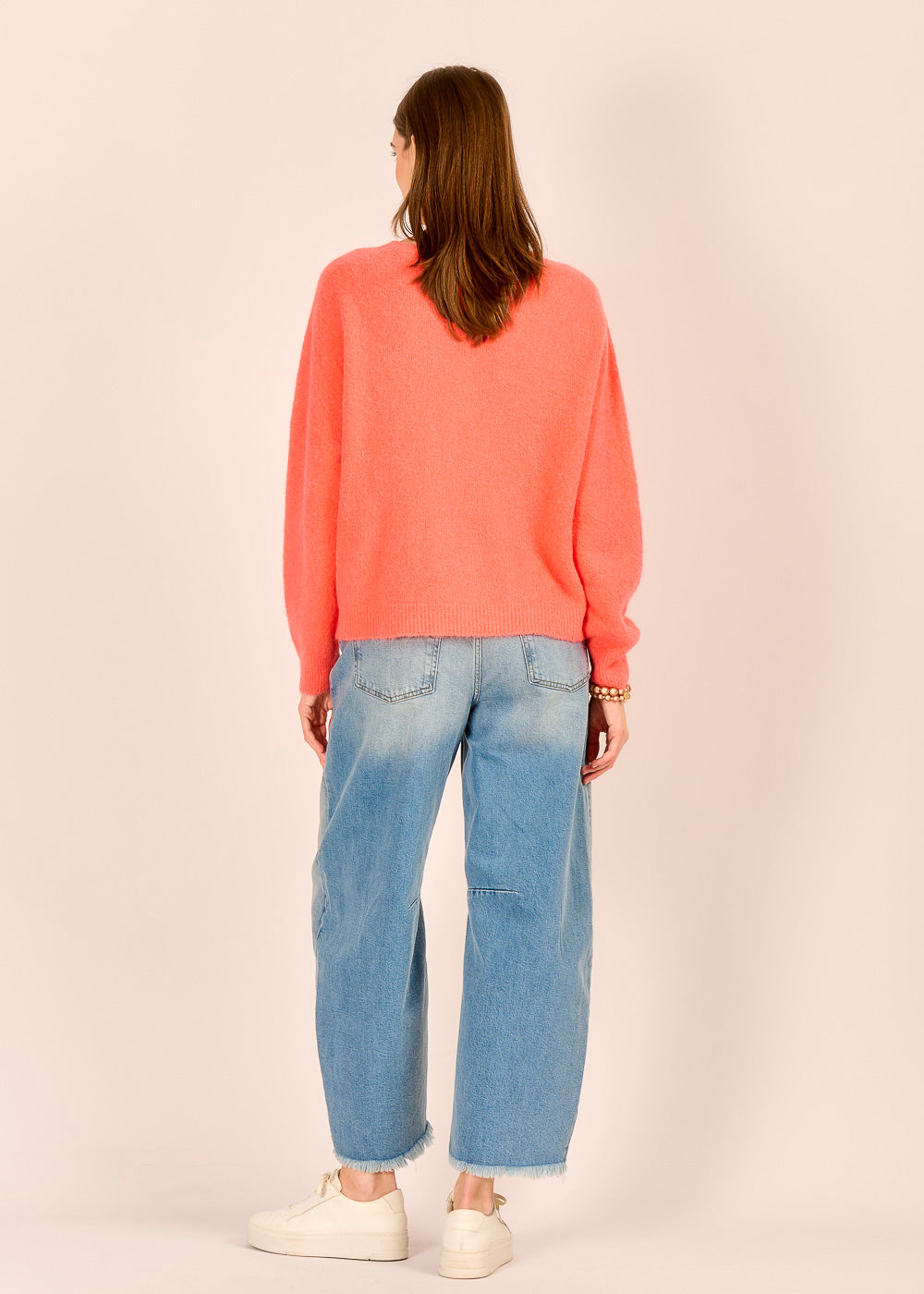Unser beliebter Wohlfühlpullover in leuchtendem Corallo umhüllt und wärmt dich an kühlen Tagen. Der lässige Schnitt lässt sich perfekt über einer Bluse stylen und die weiche Babyalpakawolle verleiht Denim Looks eine softe Note.
